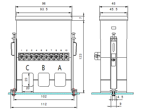 1.在柜内合适的位置开两个间距为102mm的Φ4.5mm圆孔,用两个M4螺栓配合螺母压住配套长支架下端,把DeM200J配套电流互感器固定住;