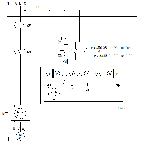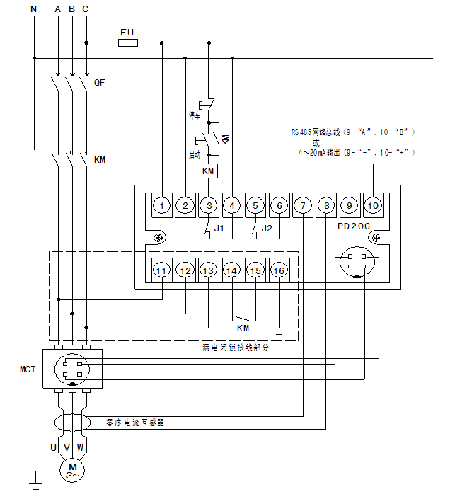 注2:图中MCT为保护器自带电流互感器,≤200A 电流规格保护器,主线路A、B、C三相一次穿芯即可;当电动机的额定电流大于200A时,需接外部保护CT,将CT二次侧5A电流线每相在保护器的MCT上绕5匝。