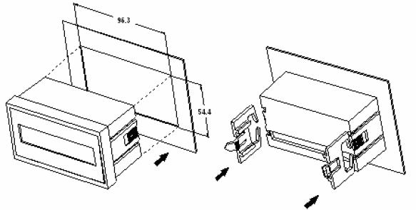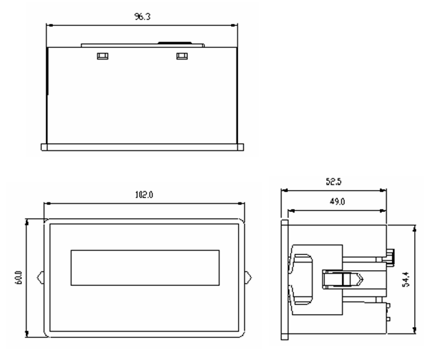 ● 显示模块安装示意图(开孔尺寸建议为96.5mm×54.5mm):